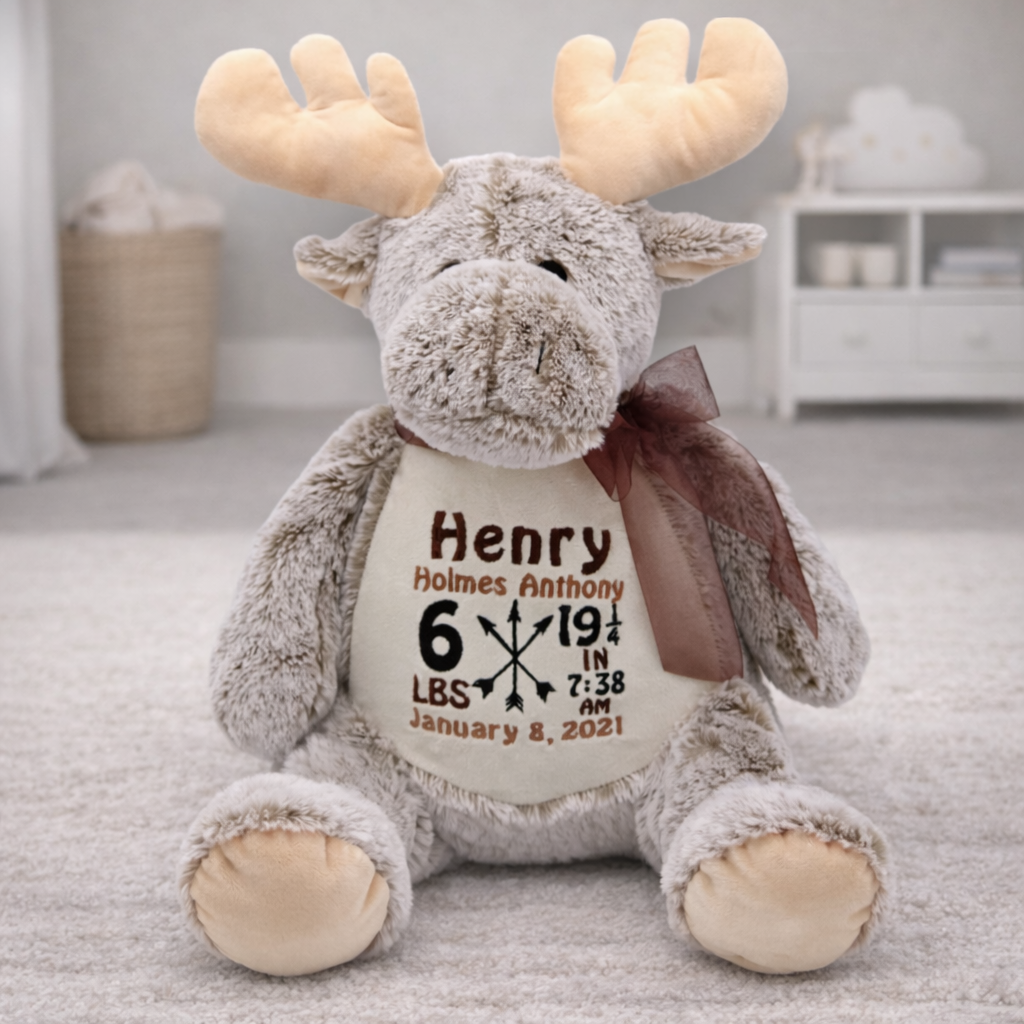 Meet Mason the Moose! This adorable plushie can be personalized in so many ways to make a beautiful keepsake or perfect gift for any occasion! It has a removable stuffing pod and is machine washable! Plushie is approximately 12" in a sitting position.