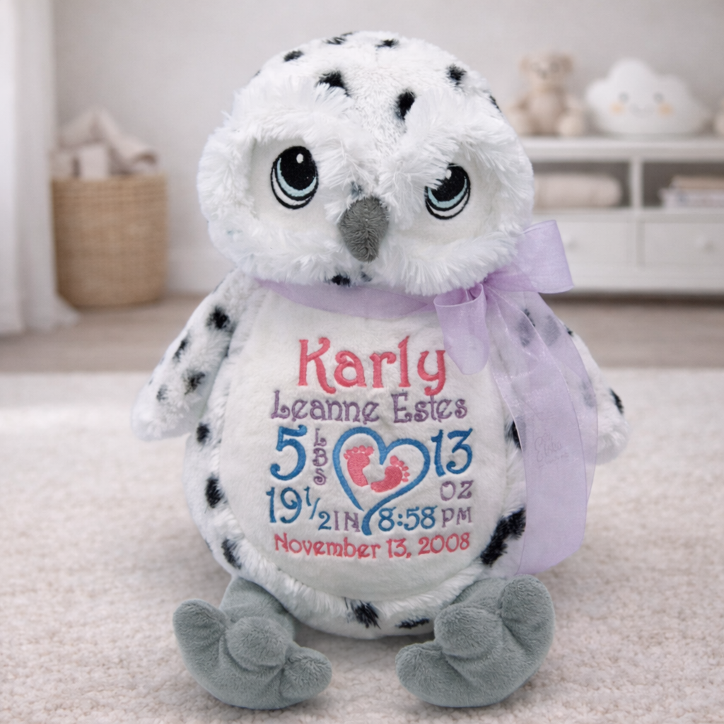 Meet Sam the Snow Owl! This adorable plushie can be personalized in so many ways to make a beautiful keepsake or perfect gift for any occasion! It has a removable stuffing pod and is machine washable! Plushie is approximately 12" in a sitting position.