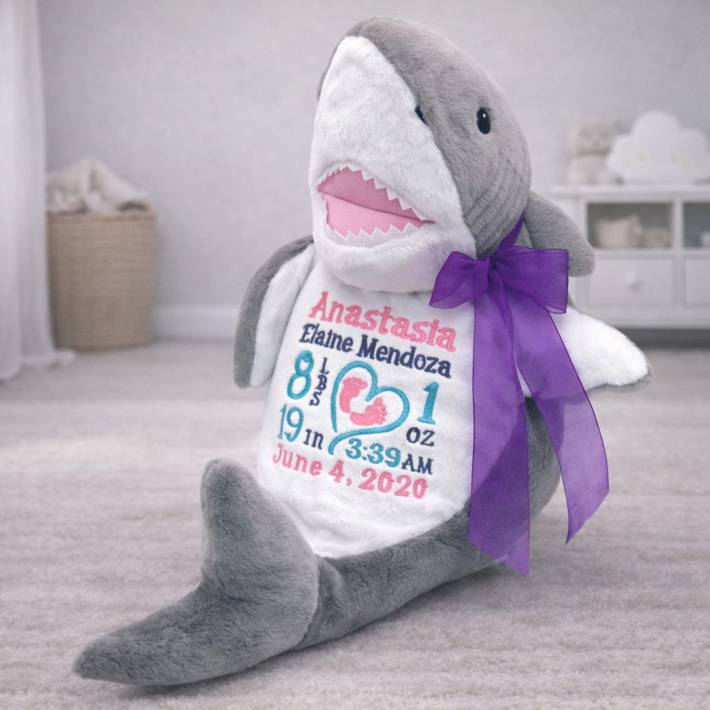 Meet Sebastian the Shark! This adorable plushie can be personalized in so many ways to make a beautiful keepsake or perfect gift for any occasion! It has a removable stuffing pod and is machine washable! Plushie is approximately 12" in a sitting position.
